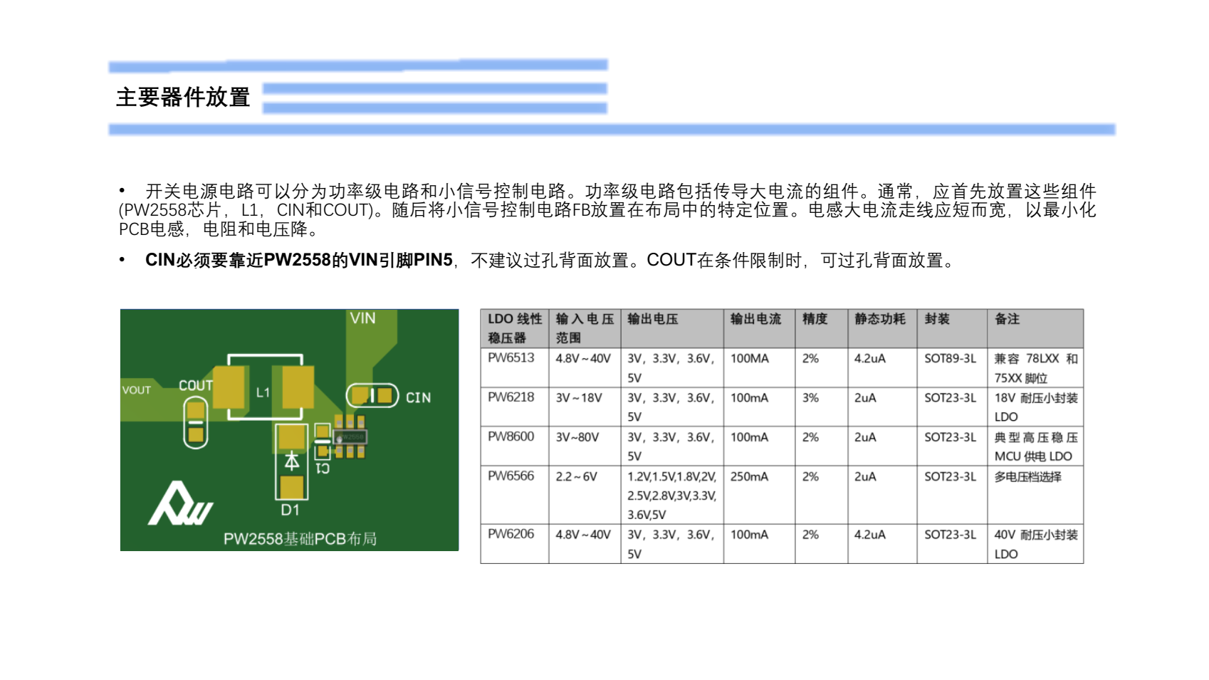 • CIN必须要靠近 PW2558的 VIN引脚 PIN5 ,不建议过孔背面放置。 COUT 在条件限制时,可过孔背面放置。