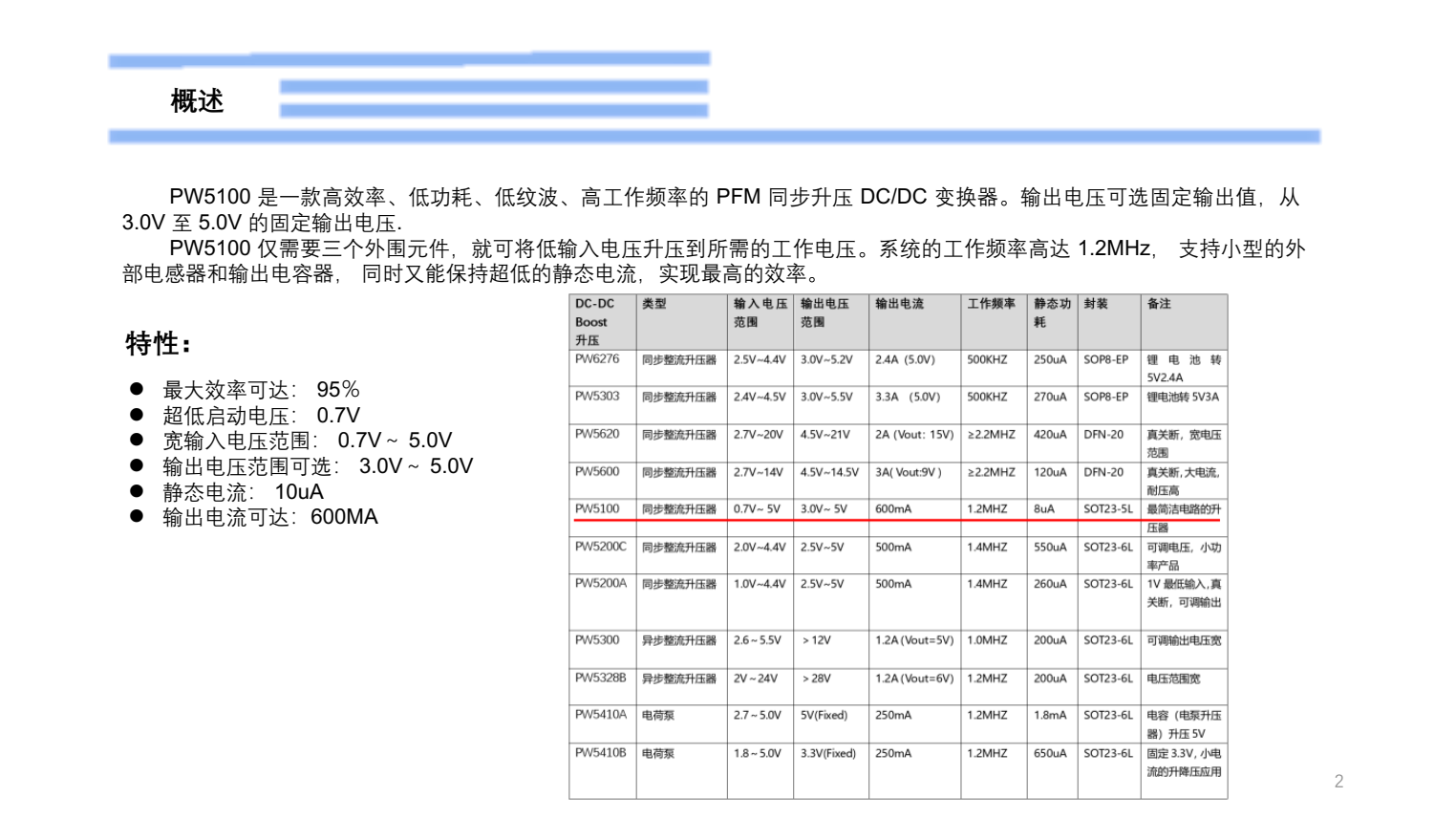PW5100 是一款高效率、 低功耗、 低纹波、 高工作频率的 PFM 同步升压 DC/DC 变换器。 输出电压可选固定输出值, 从