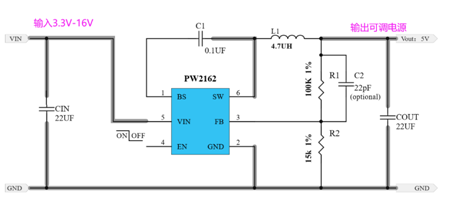 PW2162是一颗 DC-DC同步降压降压换器芯片,输入电压范围 4.5V-16V,最大可负载电流 2A,可调输出电压,频率 600kHZ高频率,可采用贴片电感,节省空间,采用 SOT23-6封装形式。