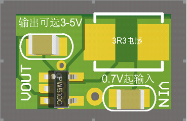 PW5100输入电压范围0.7V-5V,输出固定电压:3V,3.3V,5V,效率最高95%,低功耗10Ua,芯片开关电路1.5A,封装SOT23-5,电感采用1uh-10uh。