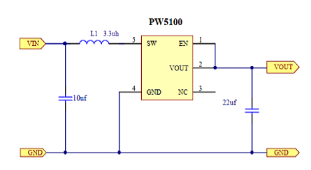 PW5100输入电压范围0.7V-5V,输出固定电压:3V,3.3V,5V,效率最高95%,低功耗10Ua,芯片开关电路1.5A,封装SOT23-5,电感采用1uh-10uh。