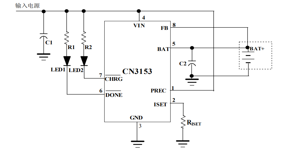 CN3153是可以对单节锂电池进行恒流/恒压充电管理的集成电路。该器件内部包括功率晶体管,应用时不需要外部的电流检测电阻和阻流二极管。CN3153只需要极少的外围元器件,非常适合于便携式应用的领域。热调制电路可以在器件的功耗比较大或者环境温度比较高的时候将芯片温度控制在安全范围内。恒压充电电压可以通过一个外部的电阻调节。充电电流通过一个外部电阻设置。在电池电压较低时,CN3153处于涓流充电模式,涓流充电电流可选择为恒流充电电流的10%或100%。当输入电压掉电时,CN3153自动进入低功耗的睡眠模式,此时电池的电流消耗小于3微安。其它功能包括电池短路保护,输入电压过低锁存,自动再充电,充电状态/充电结束状态指示等功能。CN3153采用散热增强型的8管脚小外形封装
