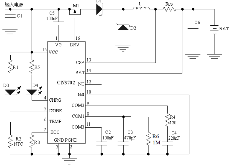 CN3702 是 PWM 降压模式双节锂电池充电管理集成电路,独立对锂电池充电进行自动管理,具有封装外形小,外围元器件少和使用简单等优点。CN3702 具有恒流和恒压充电模式,非常适合锂电池的充电。在恒压充电模式,CN3702将电池电压调制在 8.4V,精度为±1%;在恒流充电模式,充电电流通过一个外部电阻设置。对于深度放电的锂电池,当电池电压低于5.6V时,CN3702用所设置的恒流充电电流的15%对电池进行涓流充电。在恒压充电阶段,充电电流逐渐减小,当充电电流降低到外部电阻所设置的值时,充电结束。在充电结束状态,如果电池电压下降到8V时,自动开始新的充电周期。当输入电源掉电或者输入电压低于电池电压时,CN3702自动进入睡眠模式。其它功能包括输入低电压锁存,电池温度监测,电池端过压保护和充电状态指示等。CN3702 采用 16 管脚 TSSOP 封装。