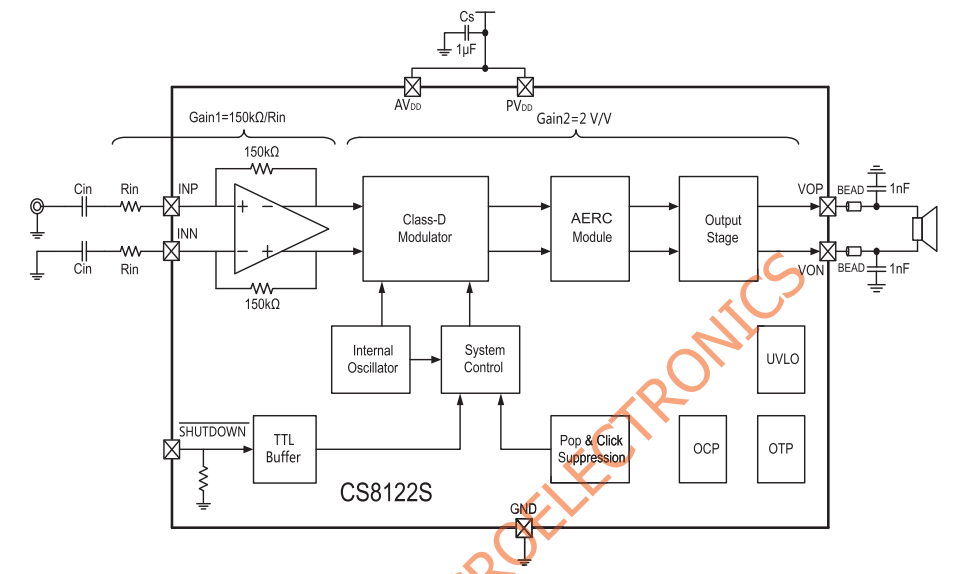 CS8122S是一款高效率,超低EMI,3.0W单声道D类音频放大器。CS8122S无需滤波器的PWM调制结构减少了外部元件、PCB面积和系统成本,而且也简化了设计。高达90%的效率,快速的启动时间和纤小的封装尺寸使得CS8122S成为小型手上设备和PDA的最佳选择。CS8122S的全差分架构和极高的PSRR有效地提高了CS8122S对RF噪声的抑制能力,并且省去了传统音频功放的BYPASS电容。 CS8122S采 用 独 创的 AERC(Adaptive Edge Rate Control)技术,能提供优异的全带宽EMI抑制能力,在不加任何辅助设计时,在FCC Part15 Class B标准下仍然具有超过20dB的裕量,特别适合FM、CMMB、手机模拟电视等易受EMI干扰的应用。 CS8122S内置了过流保护短路保护和过热保护有效的保护芯片在异常的工作条件下不被损坏。 CS8122S提供了纤小的封装形式可供客户选择其额定的工作温度范围为-40℃至85℃。