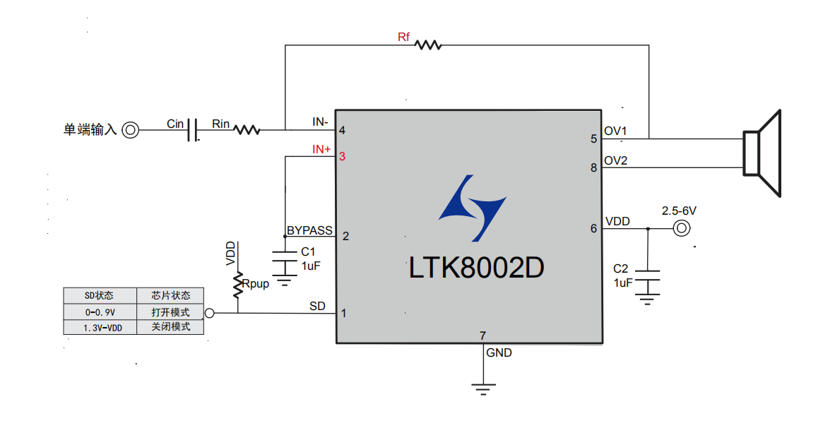 LTK8002D是一款高耐压 4.2W、单声道 AB 类音频功率放大器,工作电压 2.5V-6V,以 BTL 桥连接的方式,在 6V 电源电压下,可以给 4Ω 负载提供 THD 小于 10%、平均为 4.2W 的输出功率。在关闭模式下,电流典型值小于 1uALTK8002D 是为提供大功率、高保真音频输出而专门设计的,它仅仅需要少量的外围元器件,并且能工作在宽电压条件下(2.5-6V)。LTK8002D不需要耦合电容,自举电容或者缓冲网络,所以非常适用于小音量的低功耗的系统。