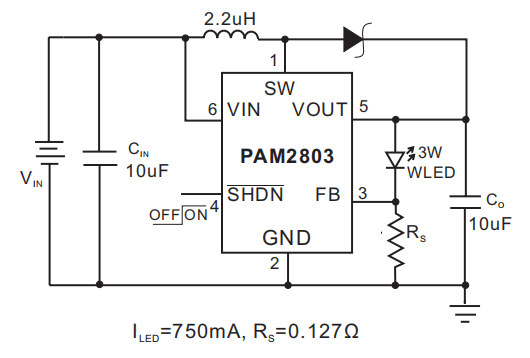 反馈引脚(FB)和接地。低95毫伏反馈电压降低了Rs的功率损耗为了提高效率。内部2A,100mΩNMOS开关,可提供高即使在重载条件下也有效率。在关闭模式,反馈电阻器Rs和负载完全断开,电流消耗量降低到1uA以下。PAM2803提供6线SOT-23-6包裹。