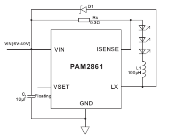 PDA照相机闪光灯便携式手电筒(手电筒)灯PAM2861是一种连续模式感应降压转换器,设计用于驱动单个或多个串联LED有效地从高于LED电压的电压源。这个设备的输入电源在6V和40V之间提供高达1A的外部可调输出电流。根据电源电压和外部部件,这可以提供高达30瓦的输出功率。PAM2861包括输出开关和高压侧输出电流感应电路,使用外部电阻器来设置额定平均输出电流。可通过以下方式调节输出值至VSET引脚的外部控制信号。VSET引脚将接受直流电压或PWM波形。软启动时间可使用外部电容器从VSET引脚接地。向VSET引脚关闭输出并将设备切换到低电平当前待机状态。