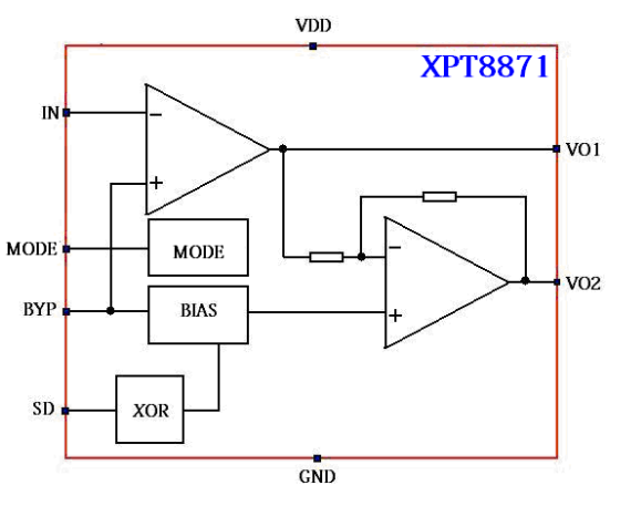 XPT8871 是一款无FM干扰,AB/D 类可选式功率放大器。5V 工作电压时,最大驱动功率为 5W(2Ω,BTL 负载,THD<10%),音频范围内总谐波失真噪声小于 1%。XPT8871的应用电路简单,只需极少数外围器件,集成反馈电阻;输出不需要外接耦合电容或上举电容和缓冲网络。 XPT8871 采用 MSOP/SOP/ ESOP/DFN 封装,特别适合用于小音量、小体重的便携系统中。可以通过控制进入休眠模式,从而减少功耗。XPT8871 内部具有过热自动关断保护机制;工作稳定,增益带宽积高达2.5MHz,并且单位增益稳定。反馈电阻内置,通过配置外围参数可以调整放大器的电压增益及最佳音质效果,方便应用。