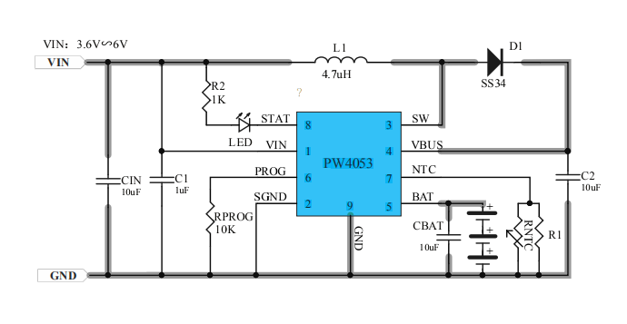 PW4053 输入电压为 5V,内置自适应环路,可智能调节充电电流大小,防止拉垮适配器输出,