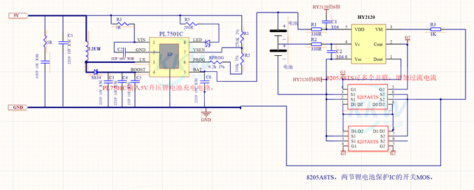 目前主流 5V输入,专门升压充两节的锂电池充电芯片已经是很普遍了,如 PL7501C,常见物料,升压 +充电 +指示灯,采购也方便,成本也低,也是都转用专门的两节锂电池充电管理芯片 PL7501C。
