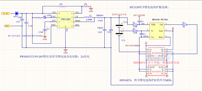 高压输入 9V至 20V范围的,降压型的充电电路。如 PW4203,输入范围 9V-20V,充电电流可达 2A。 MOS管 8205A8TS, TSSOP8封装。可以多个 MOS并联来达到和提高更大的过流保护值。