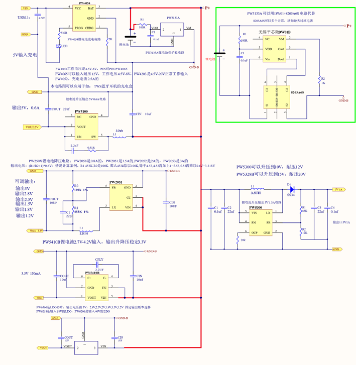- PW5328B,锂电池升压4.5V ~20V。(注:型号众多,不能一一列举)
