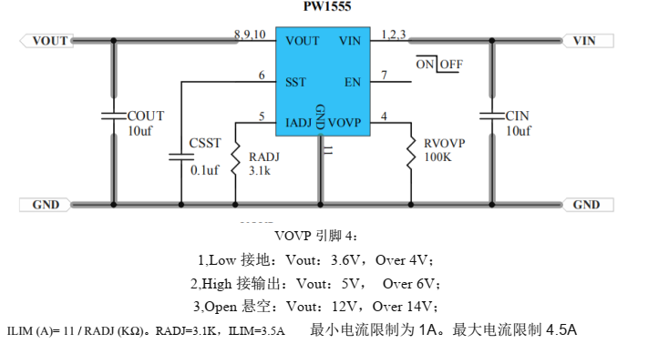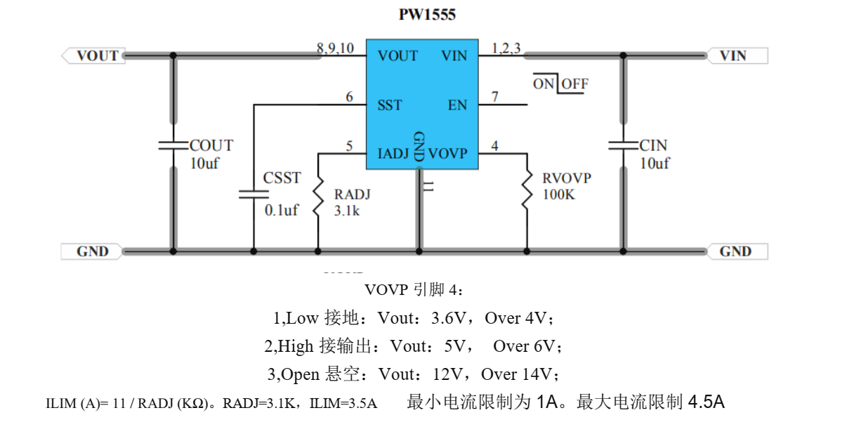 PW1555 是一个可编程的限流开关,具有输入电压范围选择和输出电压钳位。集成保护 N 沟 FET 的极低 RDS( ON)有助于减少正常运行时的功率损耗。可编程软启动时间控制转换率在启动期间的输出电压。独立启用控制允许复杂系统顺序控制。它集成了过热保护停机和歇斯底里自我恢复。这种集成电路和小的 DFN3X3-10 封装面积提供了小的 PCB 面积应用。