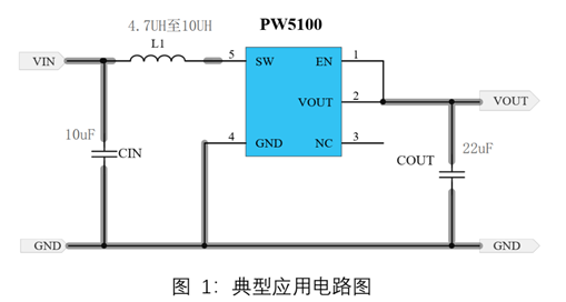 PW5100 仅需要三个外围元件,就可将低输入电压升压到所需的工作电压。系统的工作频率高达 1.2MHz。