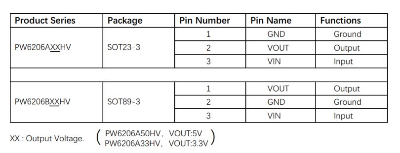 PW6206 调节器有标准 SOT89-3L 和 SOT23-3L 封装。标准产品无铅无卤。