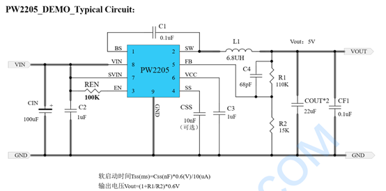 PW2205开发了一种高效率的同步降压DC-DC转换器5A输出电流。PW2205在4.5V到30V的宽输入电压范围内工作集成主开关和同步开关,具有非常低的RDS(ON)以最小化传导损失。PW2205采用瞬时脉宽调制(PWM)结构,实现高阶跃降的快速瞬态响应轻载时的应用和高效率。此外,它的工作频率是伪恒定的在连续导通模式下为500kHz,以使电感器和电容器的尺寸最小。