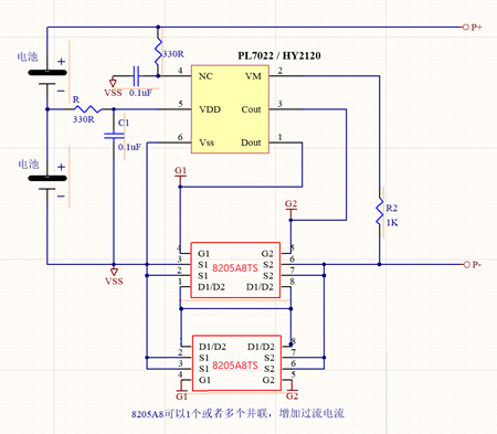 双节锂电池的保护芯片电路的过电流保护阈值是由开关 MOS管 PW8205A8TS来决定的,如果觉得小,可以多个进行并联的操作,达到增大过流电流的应用。