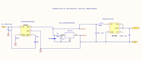 单节锂电池保护电路+锂电池充电电路+锂电池输出电路原理图: