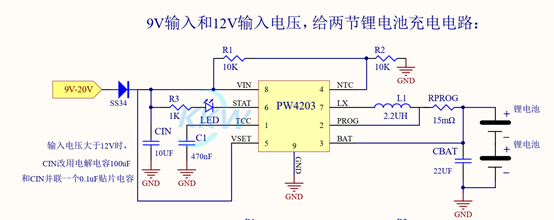 PW4203,输入9V-20V,降压给两节锂电池充电,2A最大。