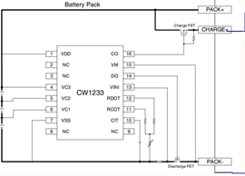 - PW3130,特点:内置MOS,电路简单, 过充电电流和过放电电流是3A,适合功率不大电子产品,采用SOT23-5封装。