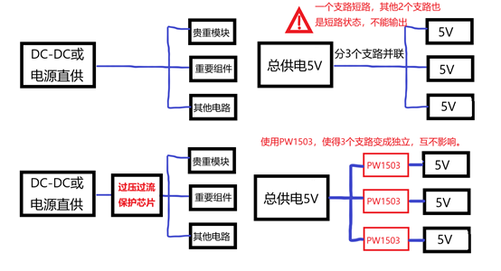 右下图:解决右上图方法就是加入PW1503,或者1502来解决这个问题,使得每一个并联的支路,变成具有自己支路独立的过流保护开关,短路保护功能,不影响其他支路的正常工作。
