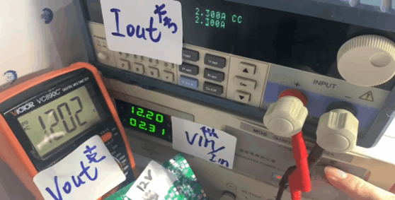 PW1555的输入电压是 12.30V,输出电压为 12.16V,负载 3A时。再负载 3A时,芯片的温度在 44度。可调限流是 1A-4.8A之间。