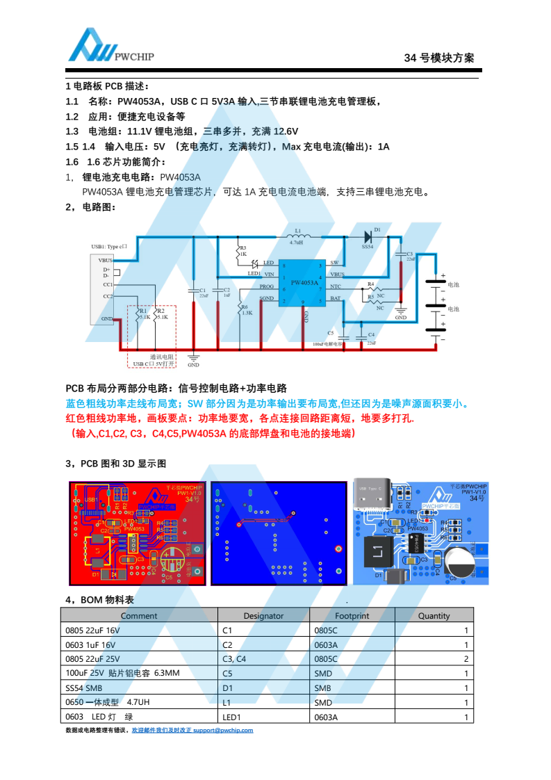 PW4053A, USB C 口 5V3A 输入,三节串联锂电池充电管理板