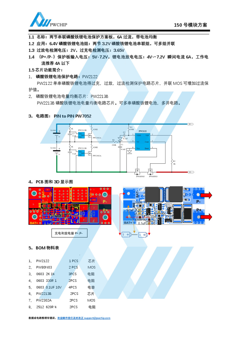 两节串联磷酸铁锂电池保护方案板, 6A 过流,带电池均衡