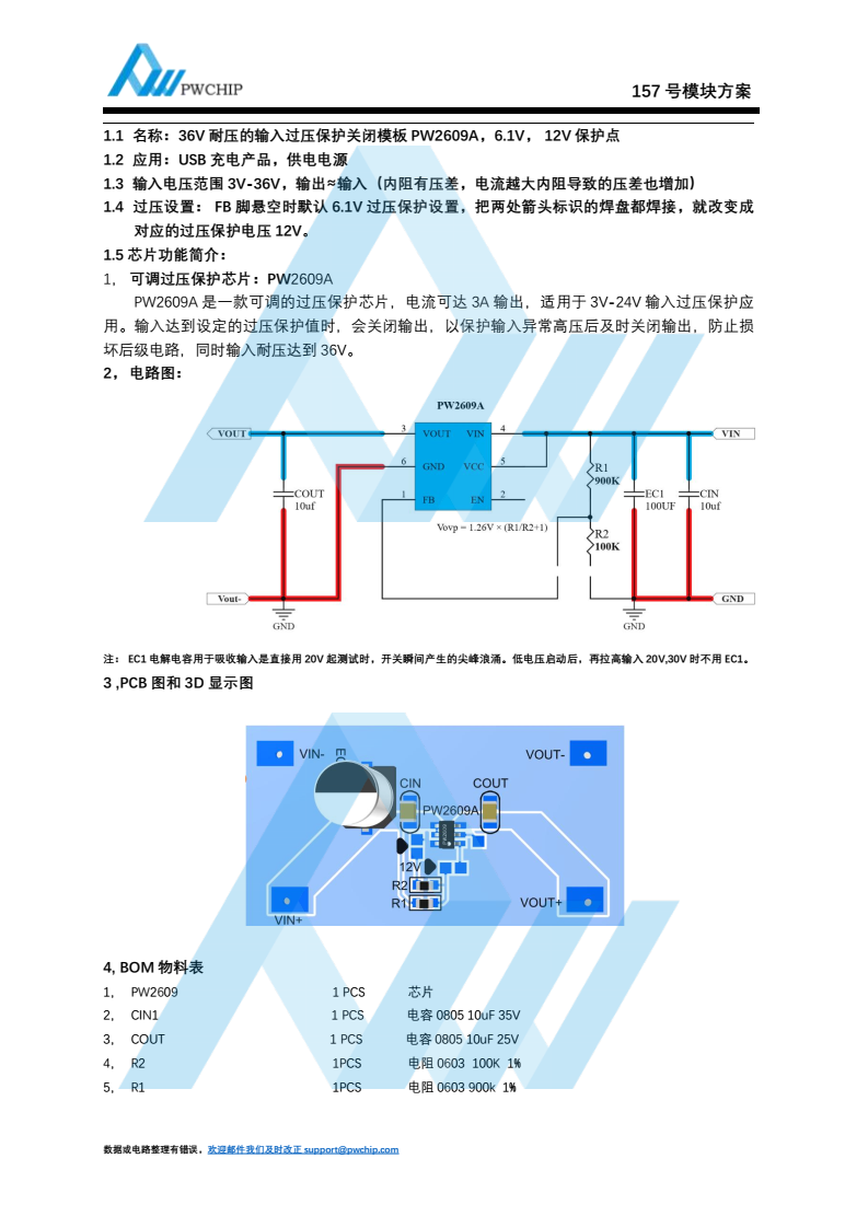 36V 耐压的输入过压保护关闭模板 PW2609A, 6.1V, 12V 保护点