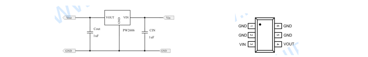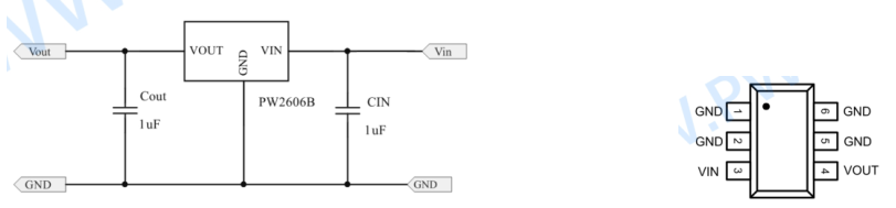 2, PW2606B, 适用于输出电流 1A, 是 PW2605 的 SOT23-6 版本, 输入过压关闭保护阈值 6.1V,当输入电压超过 6.1V,输出为 0V,输入 6.1V 以下时,输出约等于输入,输出电压=输入电压-内阻压差可输入电流 x 内阻 0.35Ω) , 输入高耐压 40V,可以防止输入高压输入损坏后级电路和芯片, 平芯微 PW2606B 采用 SOT23-6 封装.