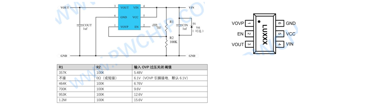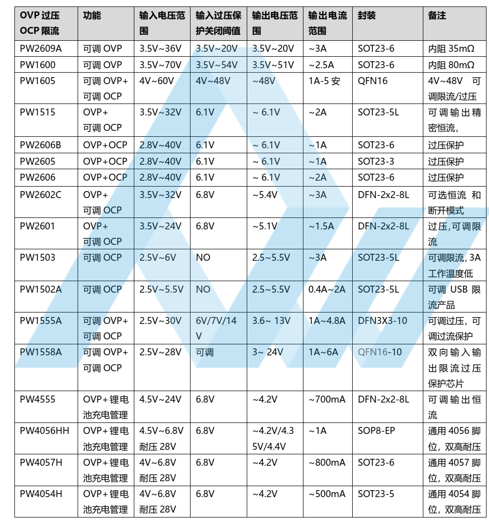 5, PW1600, 适用于输出电流 2.5A 和以下, 是更高耐压版本, 输入过压关闭保护阈值可调 4V-55V 范围和默认6.1V,如当输入电压超过 6.1V,输出为 0V,输入 6.1V 以下时,输出约等于输入,输出电压=输入电压-内阻压差可输入电流 x 内阻 0.08Ω), 输入高耐压 70V,可以防止输入高压输入损坏后级电路和芯片, PW1600 采用 SOT23-6 封装