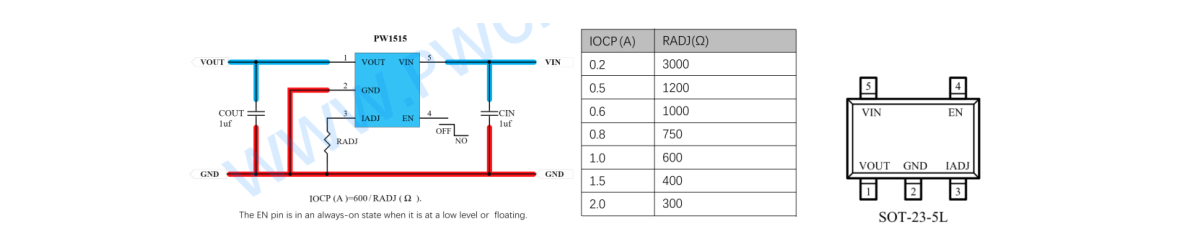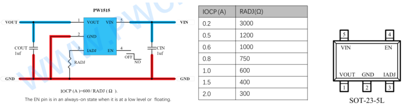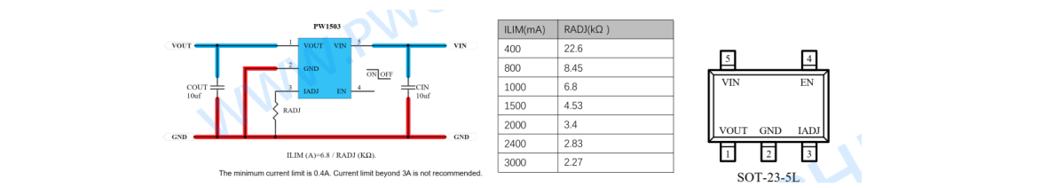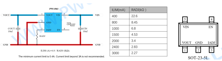 12, PW1503,适用于 1A-3A 输出应用, 是可调限流版本,可调限流 1A-3A 范围,低内阻, USB 输入范围: 2.4V-6V,输出电压=输入电压-内阻压差可输入电流 x 内阻 0.05Ω) , 采用 SOT23-5 封装。