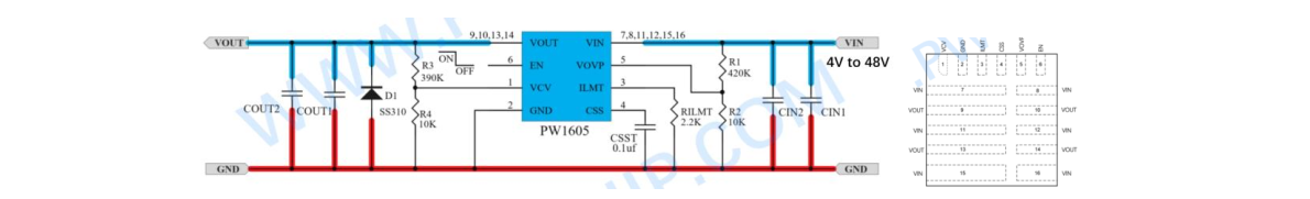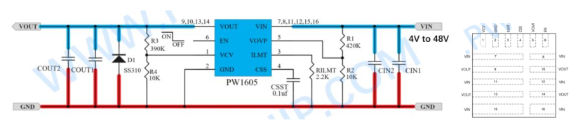 7, PW1605, 适用于输出电流 1A-5A, 是可调过压保护+可调限流的二和一版本,输入过压关闭保护阈值可调4V-51V 范围, 输入电压 4V-48V,可调设定限流 1A-5A, 同样具有输入过压关闭保护和输出限流功能。输入高耐压 60V,可以防止输入高压输入损坏后级电路和芯片, 平芯微 PW1605 采用 QFN16 封装