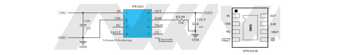 10, PW2601,适用于输出电流 1.5A 和以下, 是过压保护+可调限流+内置 LDO 的三和一版本,,可调限流 0.2A-1.5A 范围,输入过压关闭保护阈值 6.8V,当输入电压超过 6.8V,输出为 0V,输入 6.8V-5.1V 时启动 LDO稳压输出模式,输出等于 5.1V;输入低于 5.1V 时,输出电压=输入电压-内阻压差可输入电流 x 内阻 0.4Ω),输入高耐压 24V,可以防止输入高压输入损坏后级电路和芯片, 平芯微 PW2601 系列采用 DFN8 封装。PW2601 亮点: 输入 6.8V-5.1V 时启动 LDO 稳压输出模式,输出等于 5.1V;保证在输入过压关闭 6.8V 时,输出也不会有过高输出, LDO 稳压功能。 6 脚 VBAT 电池检测叫不用可以接地。