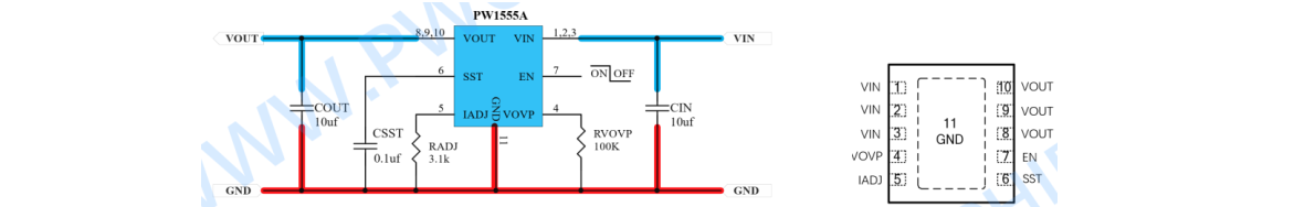 11, PW1555A,适用于 1A-5A 输出应用,是分段过压保护+可调限流的二和一版本,可调限流 1A-5A 范围,平芯微 PW1555A 采用分段模式, 即 3.3V, 5V, 12V 三段过压保护, 只能适用于这三个电压输入范围的,如 3.3V 是支持输入 2.5V-3.6V,其他电压输入负载为 0V; 5V 是支持输入 3.8V-5.4V,其他电压输入负载为0V; 12V 是支持输入 9V-12.6V,其他电压输入负载为 0V; 输入高耐压 30V,可以防止输入高压输入损坏后级电路和芯片, PW1555A 系列采用 DFN10 封装。