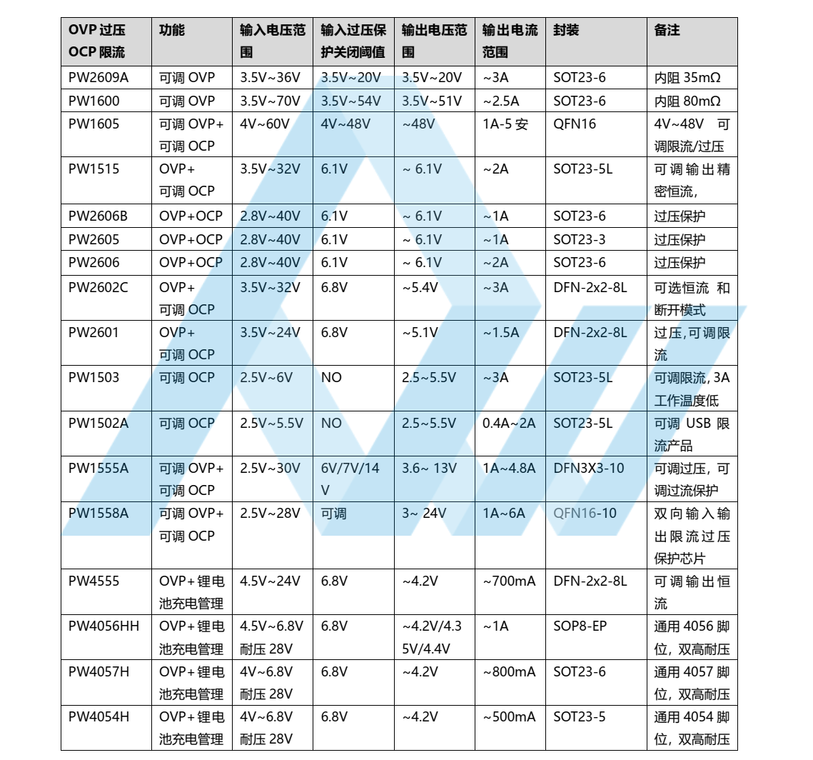 OVP过压保护芯片:40V-70V耐压,电流范围0.5A-6A,型号齐全供您选择