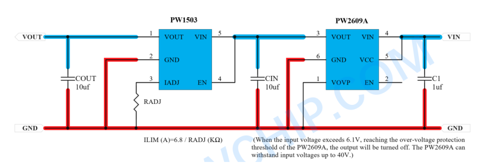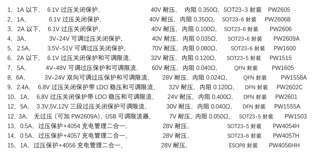 4, PW2609A, 适用于输出电流 3A 和以下, 是更低内阻,更低压差版本, 输入过压关闭保护阈值可调 4V-24V范围和默认 6.1V,如当输入电压超过 6.1V,输出为 0V,输入 6.1V 以下时,输出约等于输入,输出电压=输入电压-内阻压差可输入电流 x 内阻 0.035Ω), 输入高耐压 40V,可以防止输入高压输入损坏后级电路和芯片, PW2609A 采用 SOT23-6 封装