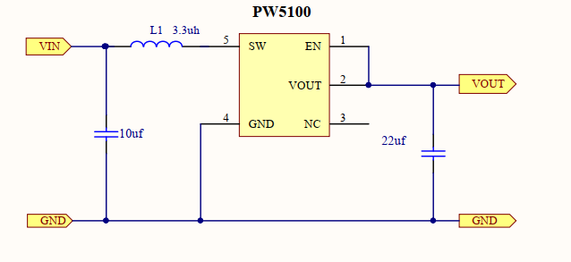 PW5100 是一款低静态电流、高效率、 PFM 模式控制的同步升压变换器。 PW5100 所需的外部元件非常少,只需要一个电感和输入、输出电容就可以提供 3.0V~5.0V 的稳定的低噪声输出电压。 芯片内部包括输出电压反馈和修正网络、纹波补偿电路、启动电路、振荡电路、参考电压电路、 PFM 控制电路、过流保护电路、同步管控制以及功率管等。振荡电路提供基准震荡频率和固定的脉宽;参考电压电路提供稳定的参考电平;并且由于采用内部的修正技术,保证了输出电压可达到± 2.5% 精度。PW5100输入电压范围0.7V-5V,输出固定电压:3V,3.3V,5V,效率最高95%,低功耗10Ua,芯片开关电路1.5A,封装SOT23-5,电感采用1uh-10uh。