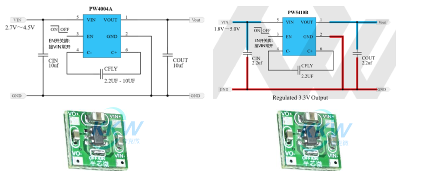7,电荷泵升压 IC 和专用干电池升压芯片的优势区别客户看到 PW5100 的外围仅两个贴片电容,一个电感被吸引了,外围元件是简单的了。新手的是能使用。有的人会想,不要电感可以吗?采用都是三个电容的方式,其实三个电容的方式叫电荷泵芯片,如 PW5410B,支持 1.8V-5V 输入,输出(升降压)恒压 3.3V,由于是升降压模式,电流采用可达 100mA; PW4004A, 2.7V~ 4.5V 输入,输出 5V,电流可达 230mA。