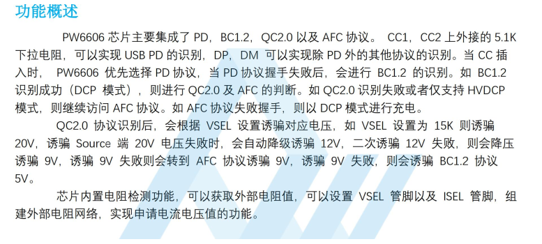 源, 那么内部的保护机制会断开 VBUS 的连接, 保证设备的安全。我的充电器是 12V 的, 但是我设置是 15V 或者 20V 输出, 怎么办? 可以向下兼容吗?PW6606 有向下兼容功能, 会根据 VSEL 引脚电阻设置诱骗对应电压, 如设置为 15K 则诱骗 20V,诱骗充电器端 20V 电压失败时, 会自动降级诱骗 12V, 二次诱骗 12V 失败, 则会降压诱骗9V, 诱骗 9V 失败则会转到 AFC 协议诱骗 9V, 诱骗 9V 失败, 则会诱骗 5V。