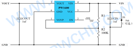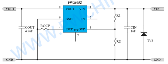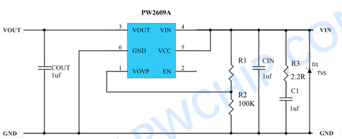 PW2609A的核心优势之一。其过压保护阈值并非固定不变,而是可以通过连接在VIN、VOVP和GND引脚之间的两个外部电阻(R1, R2)进行精确设定,范围覆盖