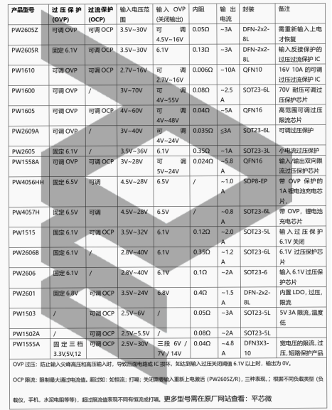 PW2605 :采用极简的 SOT23-3L 封装,仅提供最基本的 6.1V OVP和1A电流能力,是空间优先级极高的极简设计的理想选择。