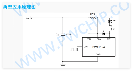 PW4115A是一款专为LED照明设计的恒流驱动芯片,其内部集成高压功率开关管,采用开关降压拓扑结构。该芯片通过外部的电感、电流采样电阻和续流二极管构建一个高效、稳定的BUCK型恒流电路。其最大优势在于高达60V的输入耐压,能够直接接入较高的直流电压或经整流后的交流电压,驱动多颗串联的LED,简化了系统设计。