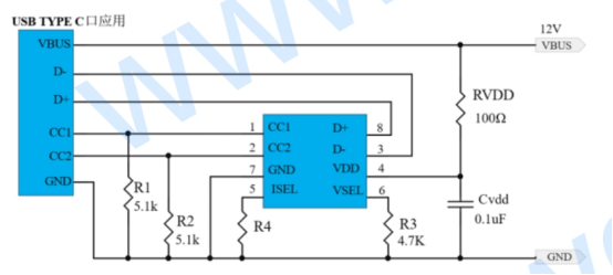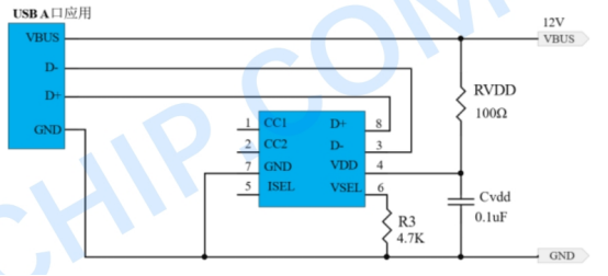 电压选择( VSEL引脚) :在 VSEL与GND间连接不同阻值的电阻R8,可设定请求的电压档位。例如:连接1kΩ电阻对应9V,4.7kΩ对应12V,10kΩ对应15V,15kΩ对应20V,不连接(NC)则默认为5V。