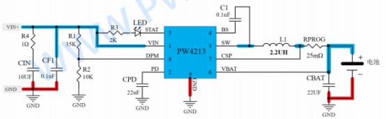 核心特性 :与前几款线性充电器不同, PW4213是一款 同步开关降压型 充电管理芯片,采用 SOP8-EP封装。其最大充电电流高达2A,且充电效率远高于线性方案,尤其在高压差(如9V/12V输入对3.7V电池充电)时优势明显,能显著减少发热。