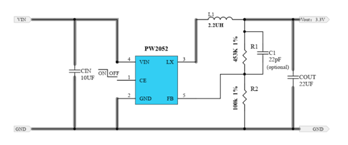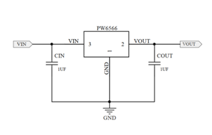 PW6566 系统采用固定输出电压: 3.3V,3V,2.8V,2.5V,1.8V,1.5V,1.2V等