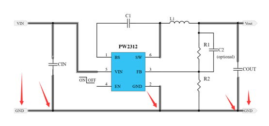 • 初接触电源设计工程师,在设计时往往忽略了功率地的回路和布线,如下图箭头处, VIN的 GND, CIN的 GND端, COUT的 GND端和 VOUT的 GND端和 PW芯片的 GND脚,这 5点,布线要宽的同时,回路连接不宜七绕八绕,要宽和直接。 CIN,COUT过孔时,也需要多打孔,布线宽。
