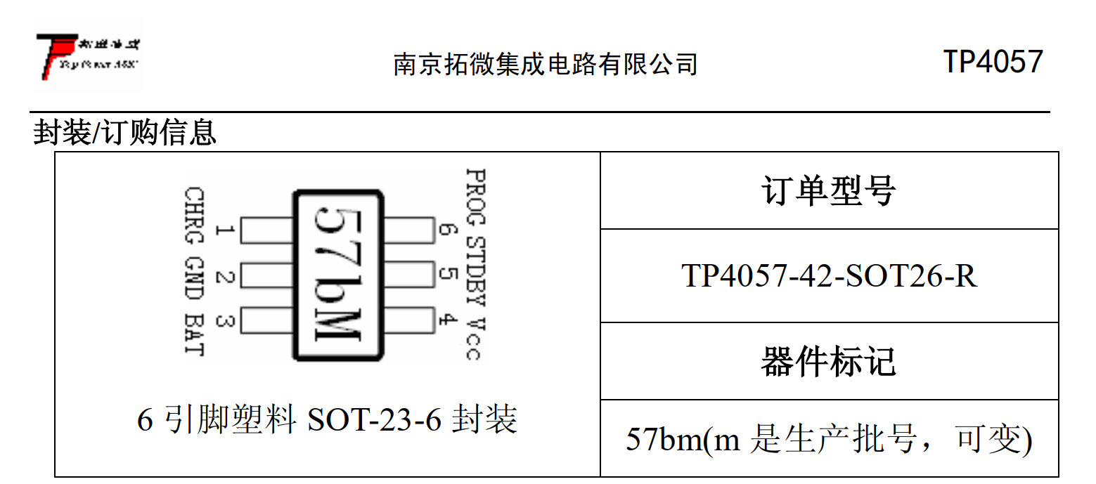 TP4057 一款完整的单节锂离子电池充电器,带电池正负极反接保护,采用恒定电流 / 恒定电压线性控制。其 SOT 封装与较少的外部元件数目使得 TP4057 便携式应用的理想选择。 TP4057 可以适合 USB 电源和适配器电源工作。由于采用了内部 PMOSFET 架构,加上防倒充电路,所以不需要外部检测电阻器和隔离二极管。热反馈可对充电电流进行自动调节,以便在大功率操作或高环境温度条件下对芯片温度加以限制。充满电压固定于 4.2V ,而充电电流可通过一个电阻器进行外部 设置。当电池达到 4.2V 之后,充电电流降至设定值 1/10 , TP4057 将自动终止充电。