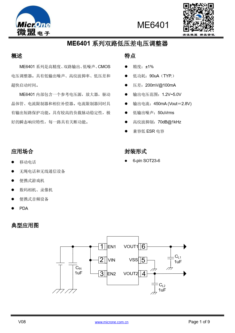 ME6401 系列是高精度、双路输出、低噪声、 CMOS 电压调整器。具有低输出噪声、高纹波抑率、低压差和 超快启动时间