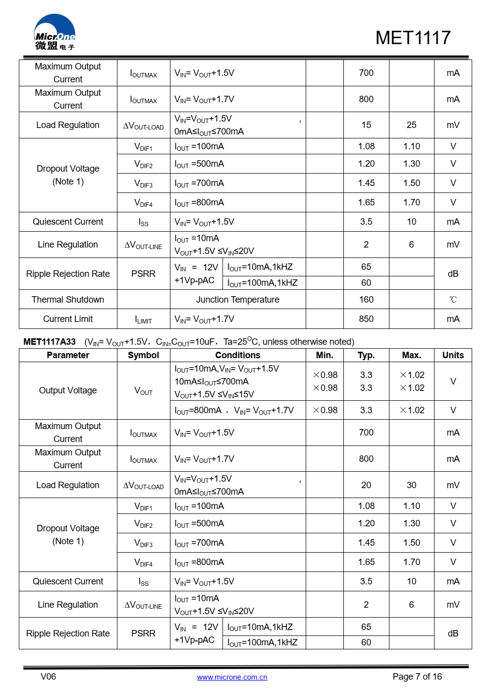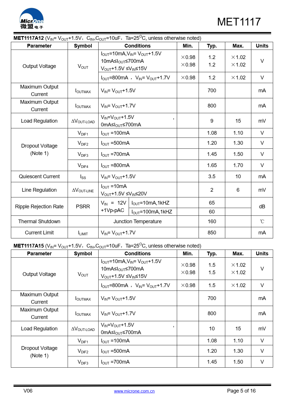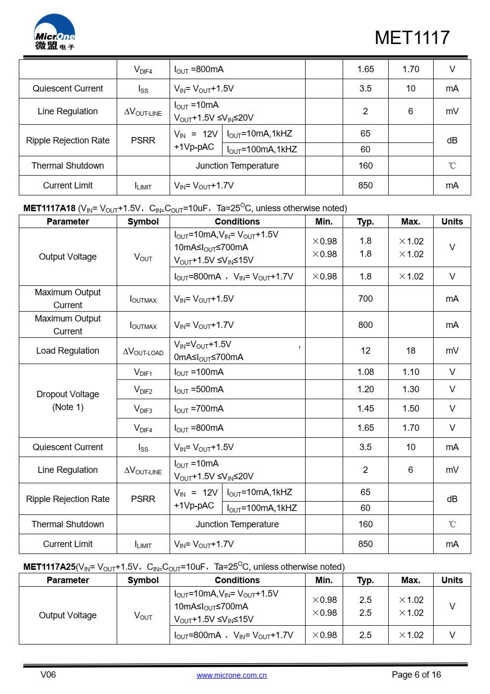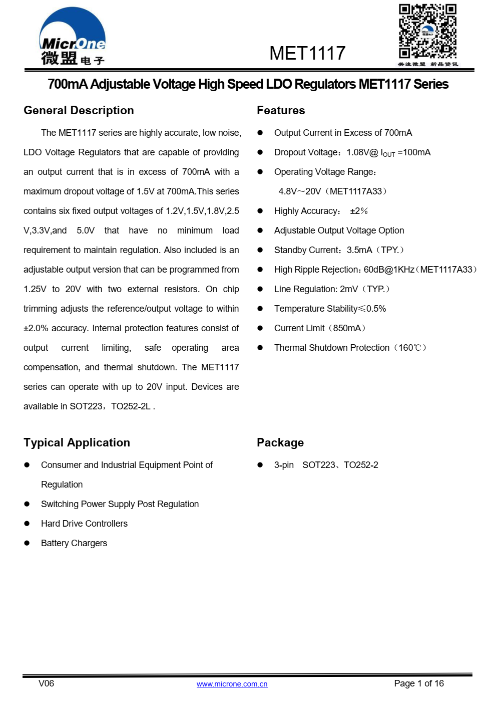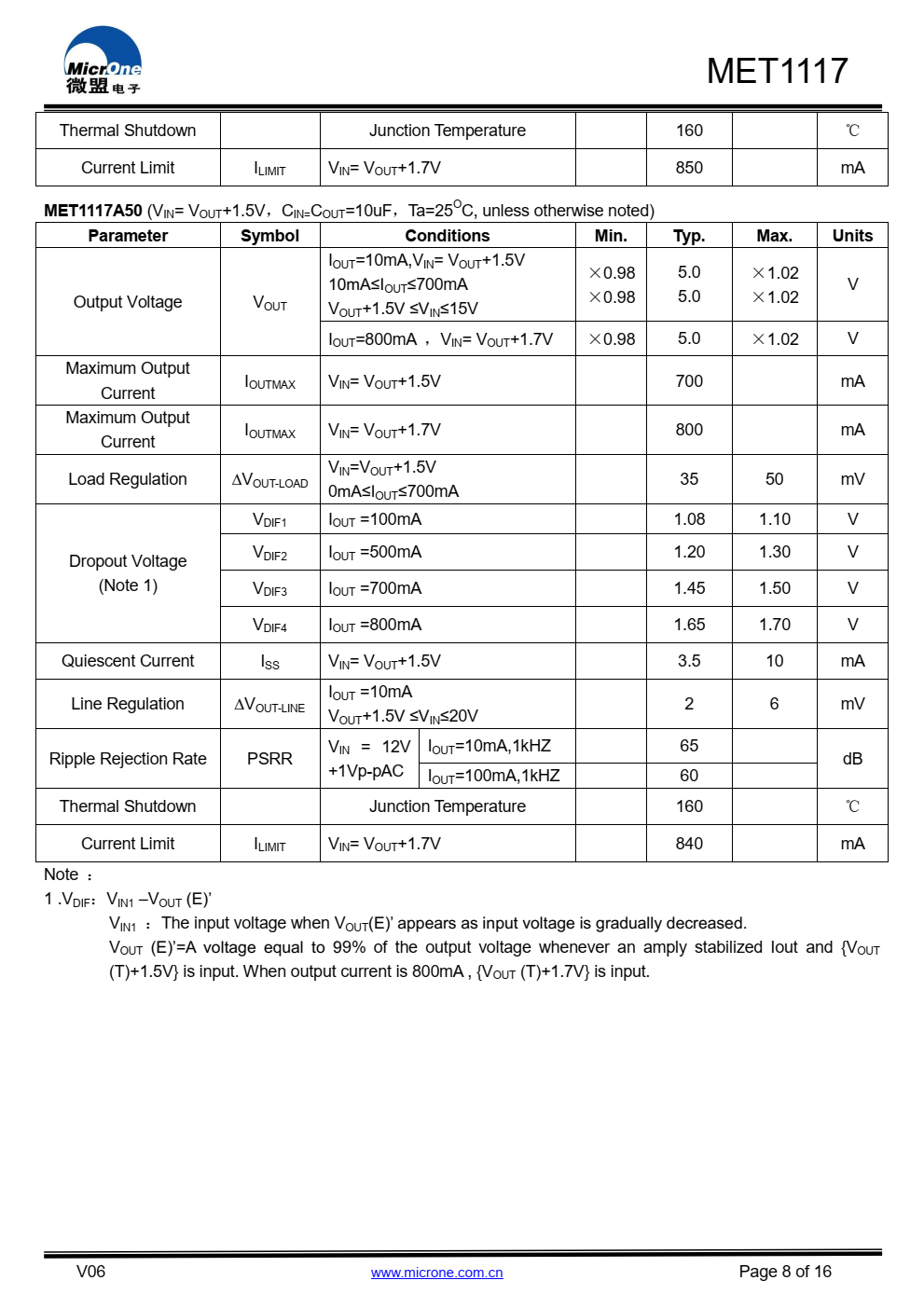 MET1117系列具有高精度、低噪音、LDO电压调节器,能够提供  输出电流超过700毫安,具有  700mA时的最大压降为1.5V